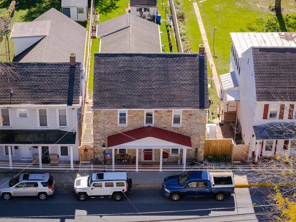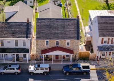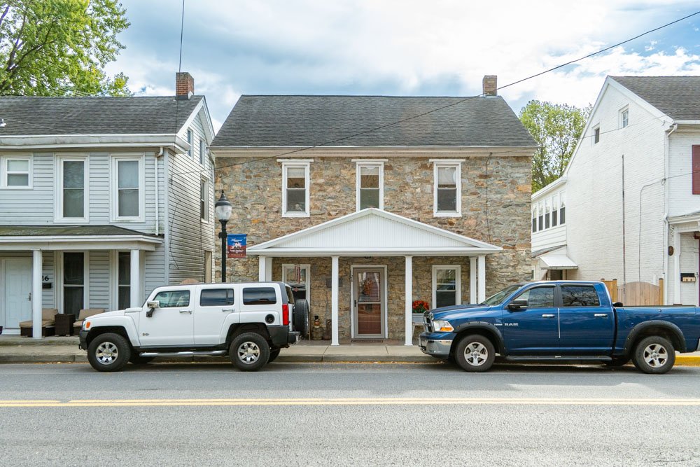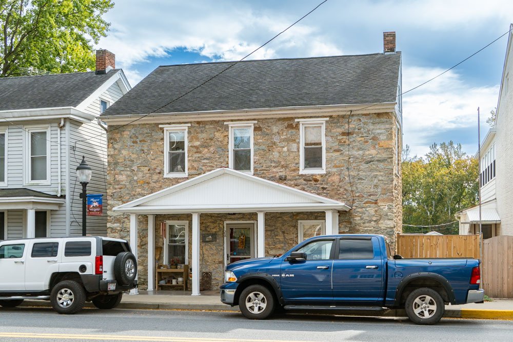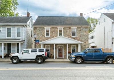 Jacob Weller (1775-1846) was a blacksmith and a grandson of Johannes Weller, a German immigrant and one of the founders of Mechanicstown (modern day Thurmont). Jacob Weller signed his name as “Jacob Weller B.S.” (aka blacksmith) to identify himself and his trade. Starting in 1805, Jacob Weller B.S. began purchasing lots in Mechanicstown. He purchased 2 lots on the north side of W. Main Street on which he constructed a large stone building (which still stands today and is 27 W. Main Street). This building was his family residence and an inn. In that same year, he purchased 2 acres on the south side of W. Main Street (lots 16, 17, 18 and 19). On this site, he built a 1-1/2 story limestone building with a peaked roof and most likely with a workshop at the rear.